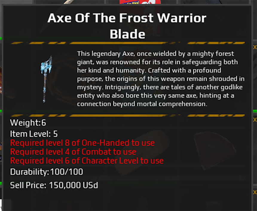“The Axe of the Frost Warrior will increase the player’s speed by 2.5% Damage by 1.7% And have abilities that deal AOE and can freeze enemies in place rooting them. Also enemies damaged by this axe will gain a cold to freeze debuff. That will decrease movement speed and fatigue. Very cold will drain fatigue completely and start to damage enemies over time.” @Sethiroth